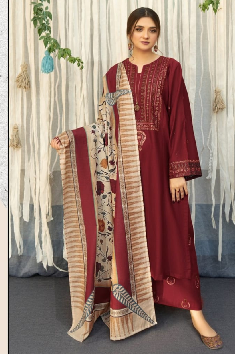 URGE AIRJET DHANAK 3PC MAROON EMBROIDERED SUIT WITH PRINTED SHAWL